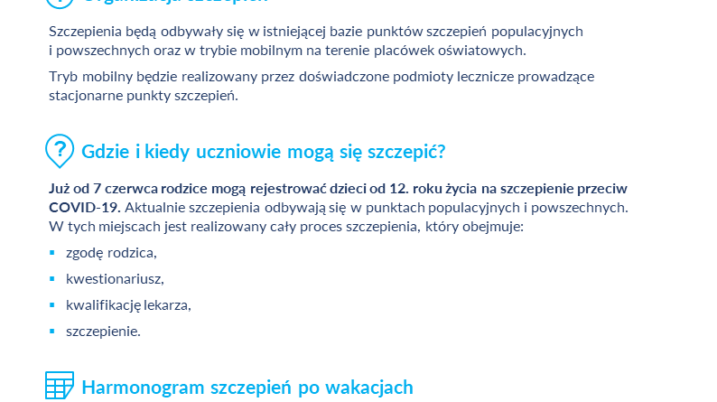 Czytaj dalejSzczepienia uczniów w wieku 12-18 lat – informacje dla szkół i placówek Od 7 czerwca rodzice mogą rejestrować na szczepienie