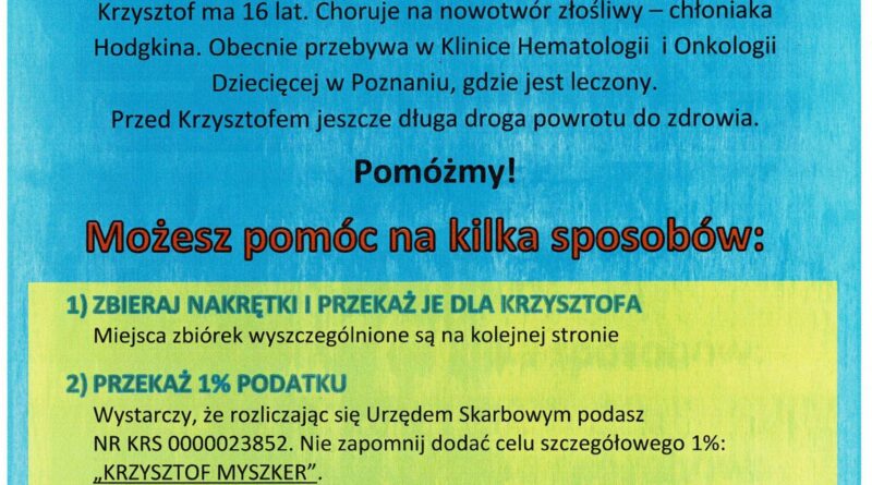 Czytaj dalejWkrótce w naszym miasteczku pojawią się dodatkowe pojemniki przeznaczone do zbiórki nakrętek dla Krzysztofa Myszkera.